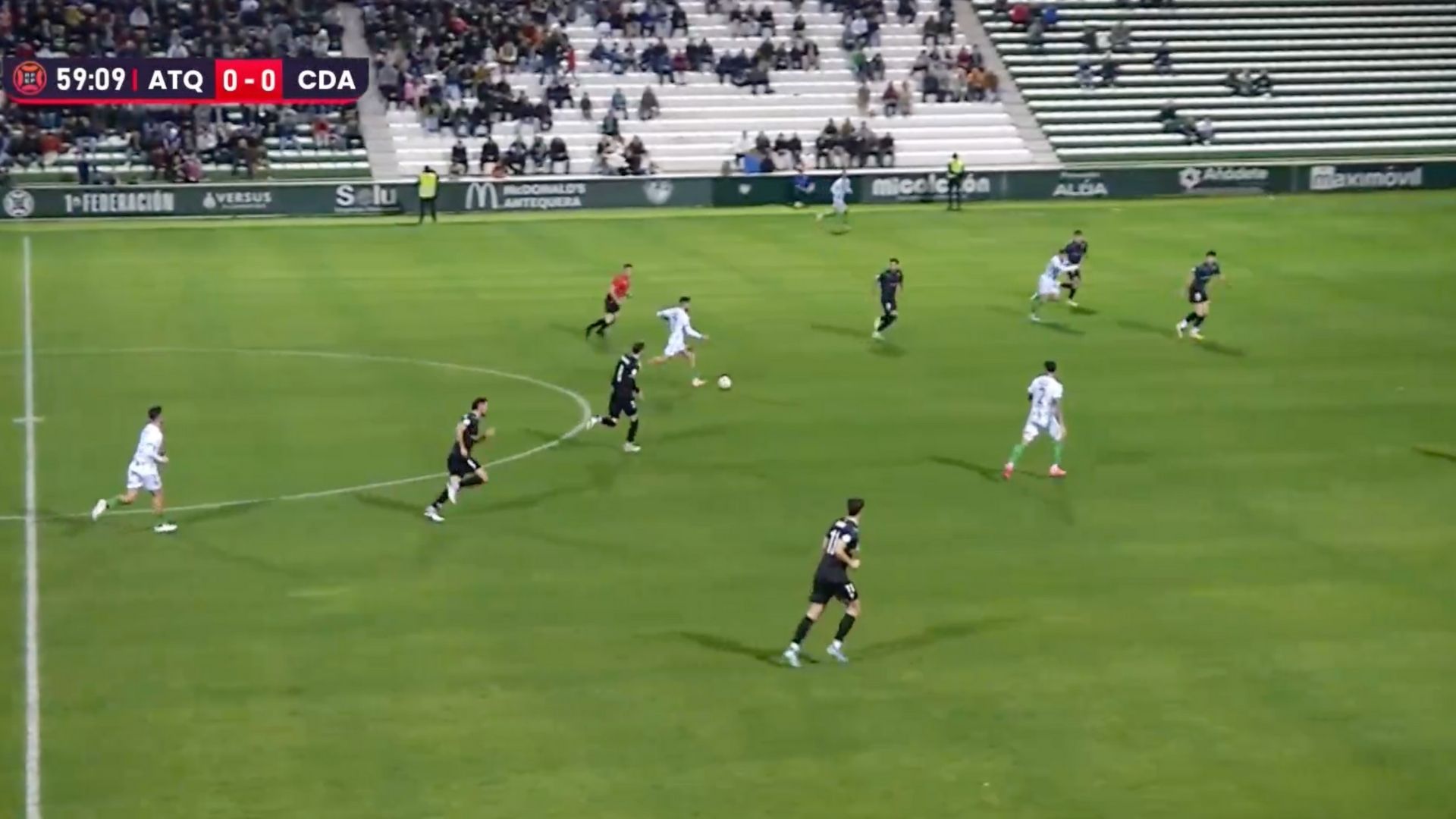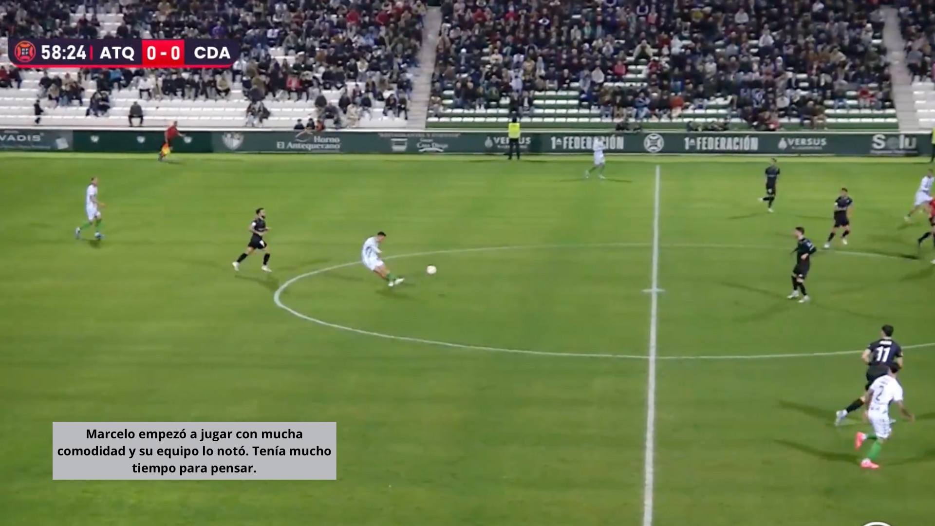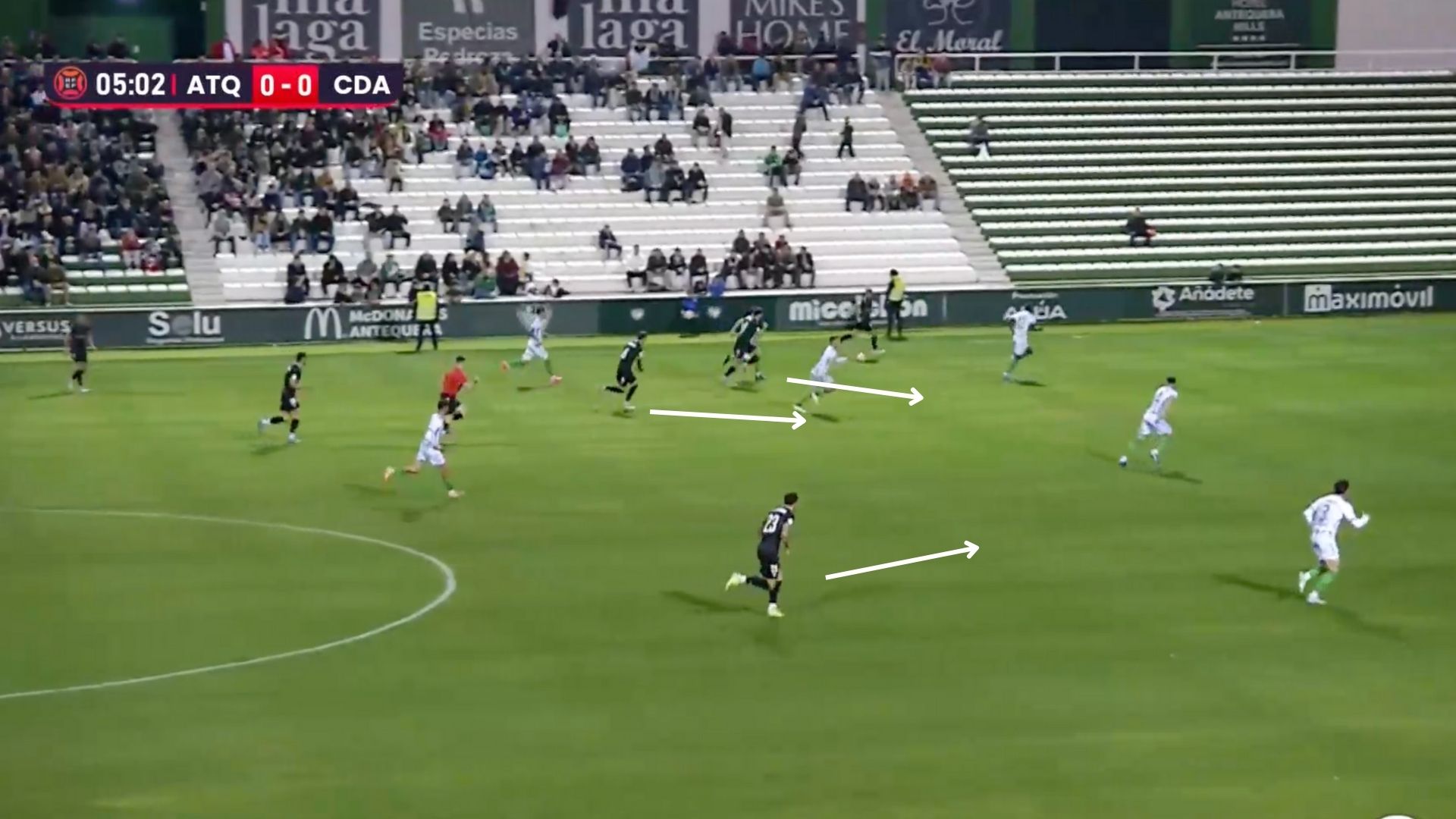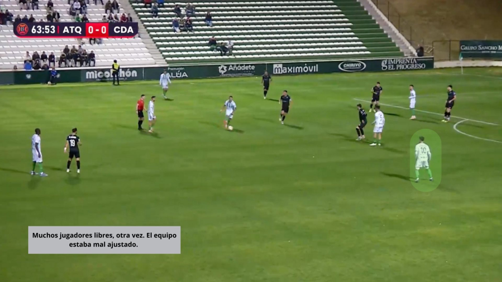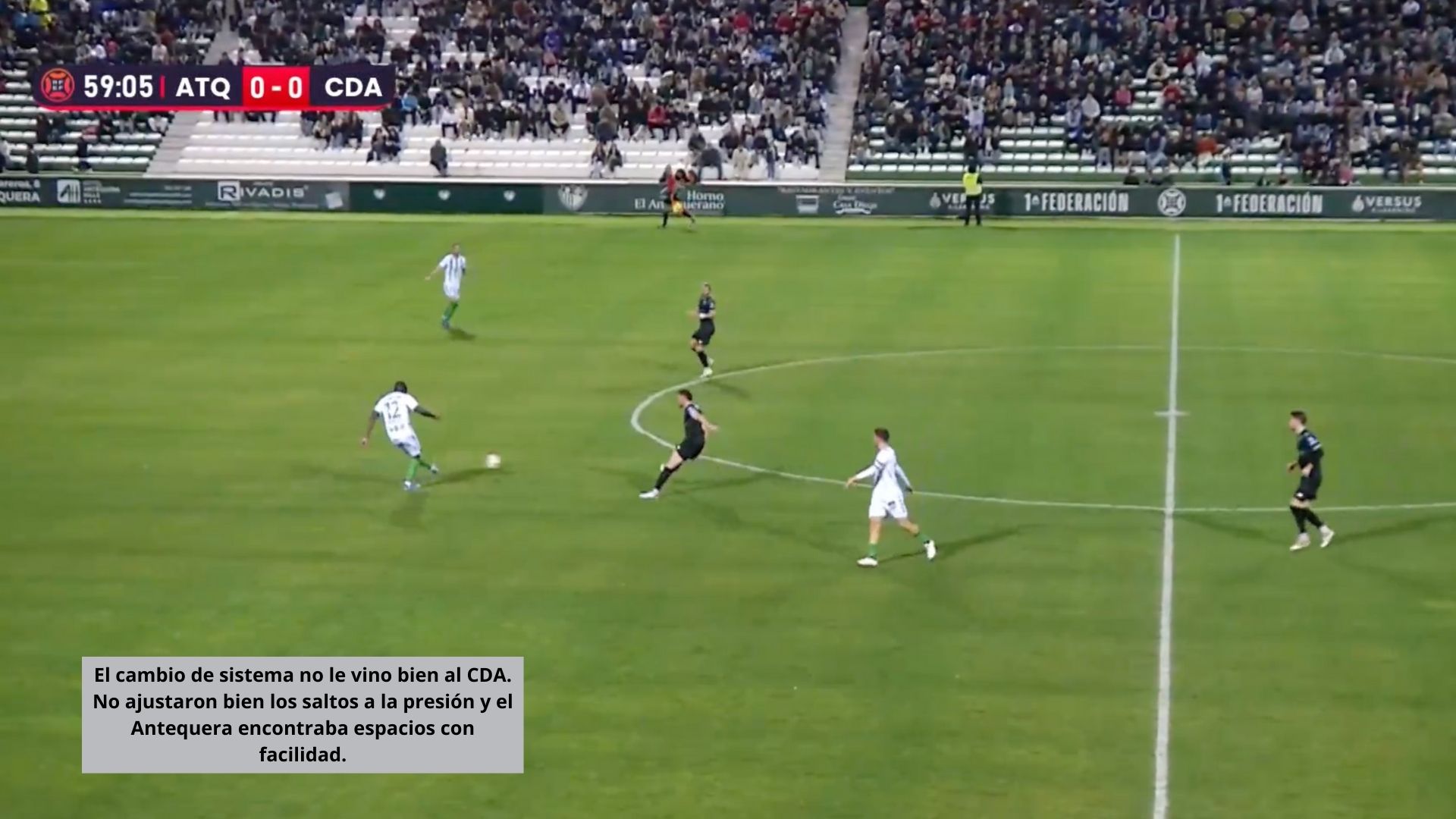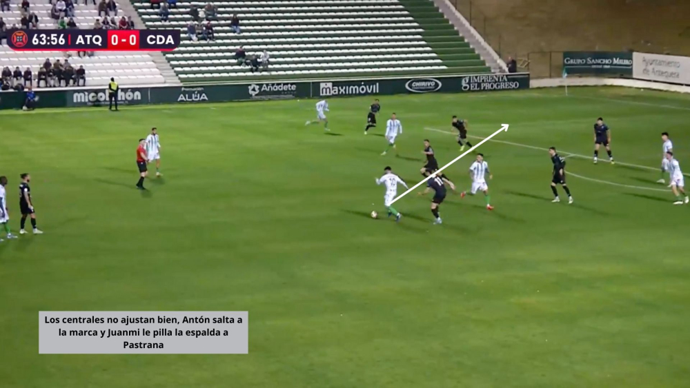 El equipo, con un defensa más, defendió peor. Los espacios eran palpables por los jugadores del Antequera, que con simples movimientos, creaban claras líneas de pase. Precisamente en uno de los desajustes defensivos llegó el pase milimétrico de Chema y el gol de Juanmi, lateral que apareció de segunda línea.