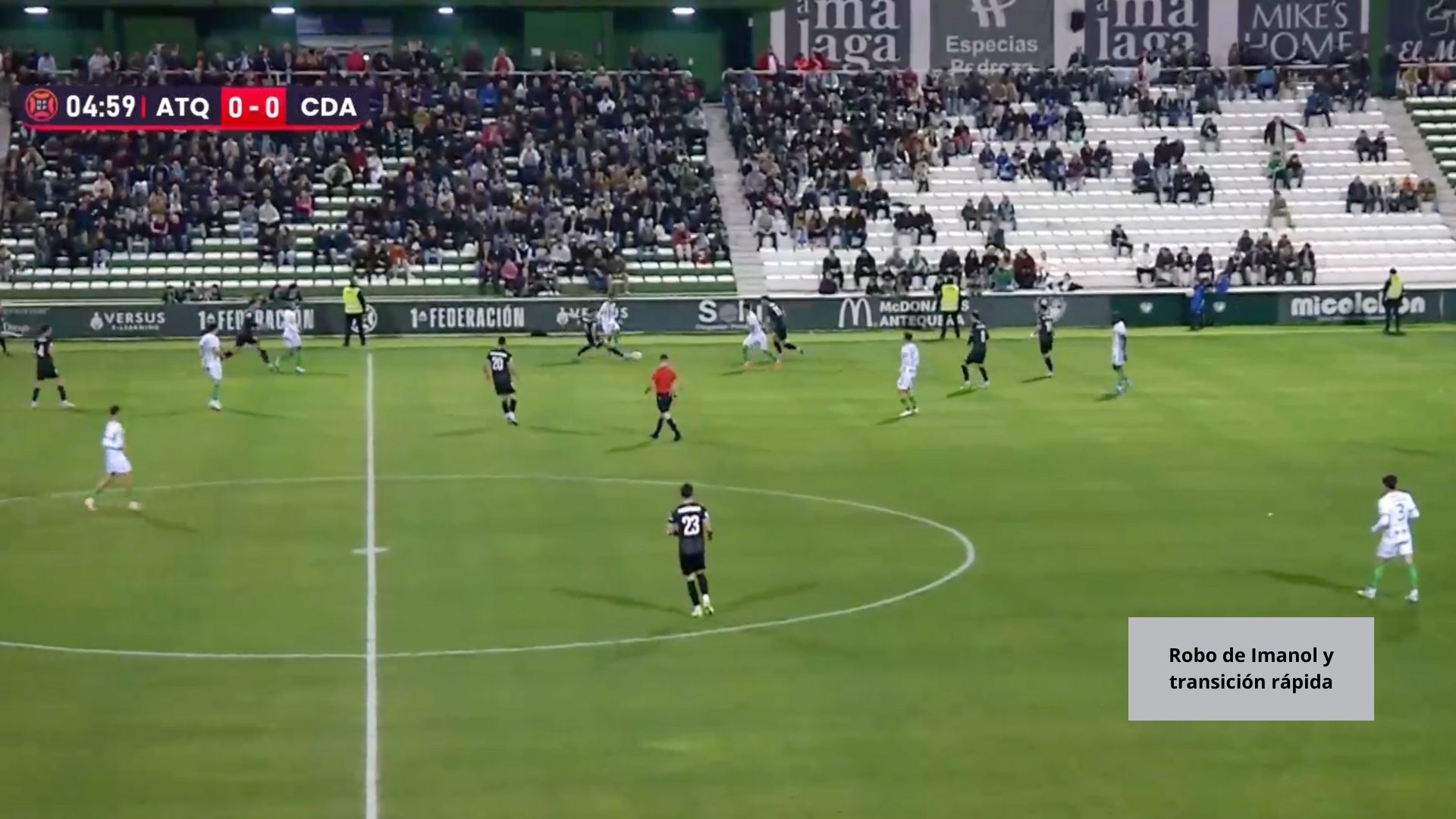 Los de Vicente Mir arrancaron con las ideas muy claras, con una presión alta y con la determinación de transicionar rápido cuando robaran el balón en zonas peligrosas. Con Imanol y Undabarrena en el centro del campo el equipo se sintió cómodo, ambos estorbaron cualquier intento de ataque del Antequera.