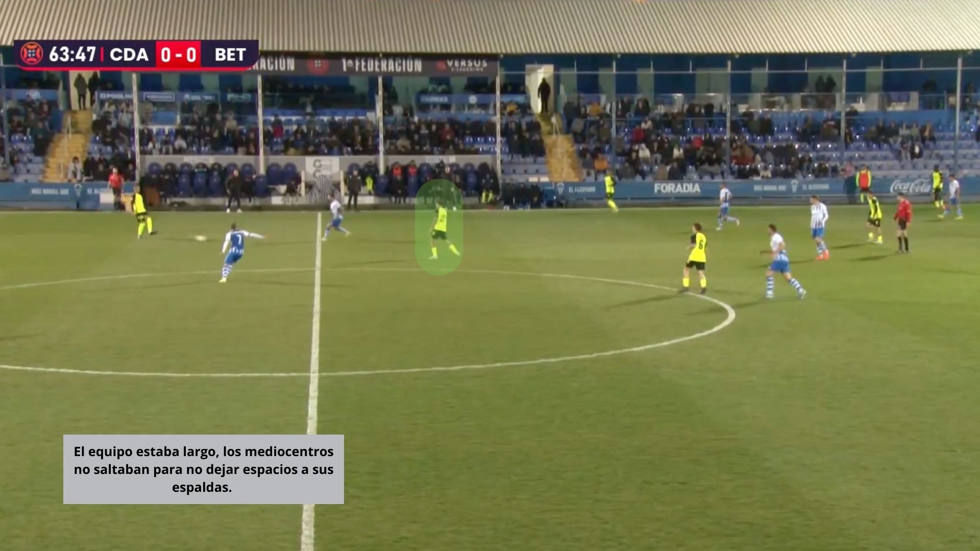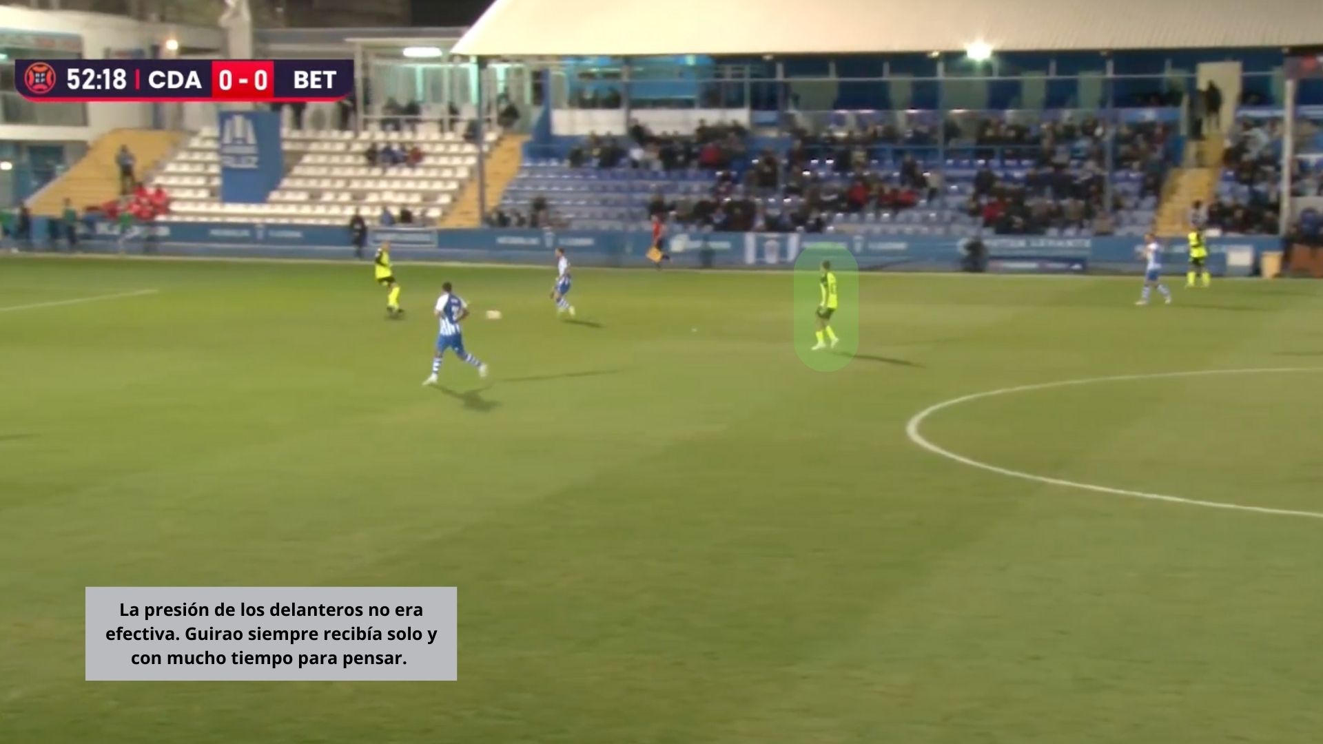 El conjunto entrenado por Arzu pudo encontrar con bastante facilidad a Guirao, tras superar la primera presión. La segunda línea, que no acababa de saltar a la presión, cerraba líneas de pase para tratar de no dejar espacios a los jugadores verdiblancos.