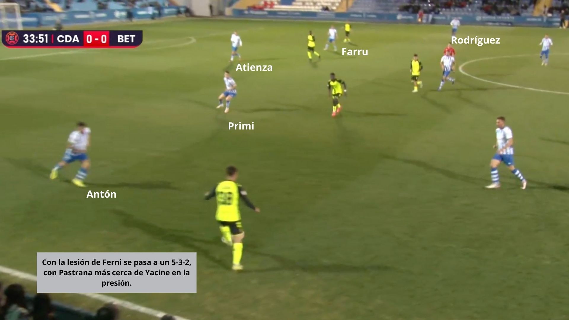 A los 32 minutos de juego se lesionó Ferni y entró Primi. Vicente Mir reorganizó al equipo en un 5-3-2, tratando de seguir defendiendo en bloque y entorpecer cualquier acercamiento del rival, y así fue.