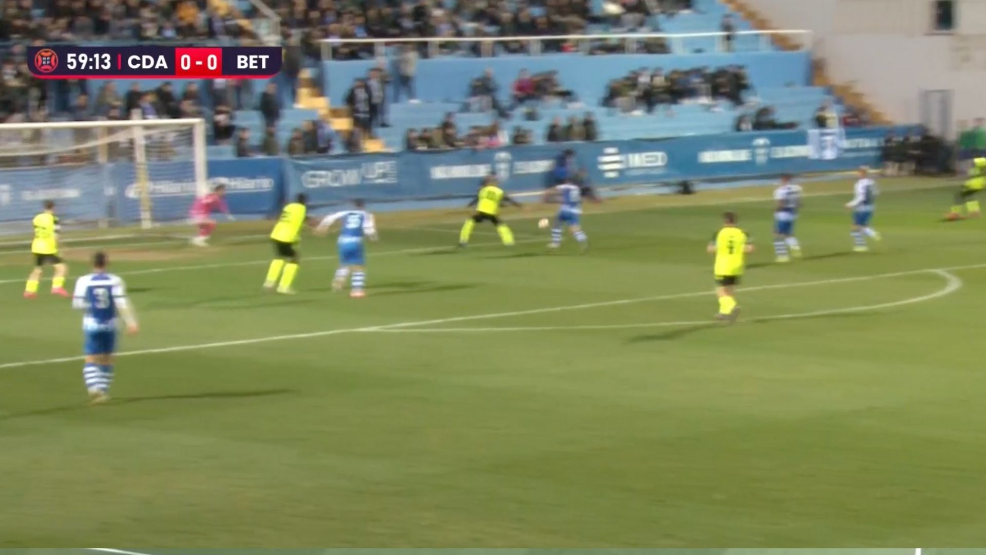 Los primeros minutos de juego ya preveían lo que sería el partido en su totalidad. El Betis Deportivo con la posesión de balón y con mucha movilidad en tres cuartos de campo pero con muy poca profundidad. Los de Vicente Mir con las líneas muy juntas, el mismo sistema que las últimas jornadas y misma alineación, salvo Losada, que no pudo jugar por sanción. En su lugar entró un Yacine que tuvo muy poca participación.